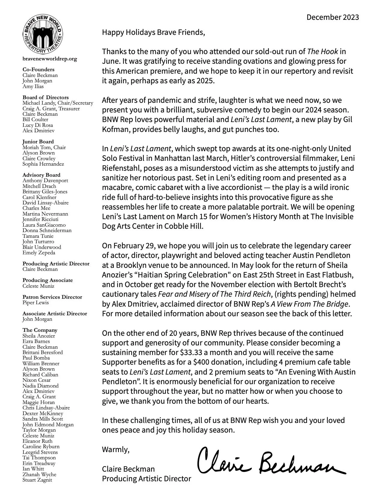 Brave New World Repertory Theatre is supported, in part, by public funds from the New York City Department of Cultural Affairs in partnership with the City Council, as well as ART/New York, and many generous individual contributors. Thank You!