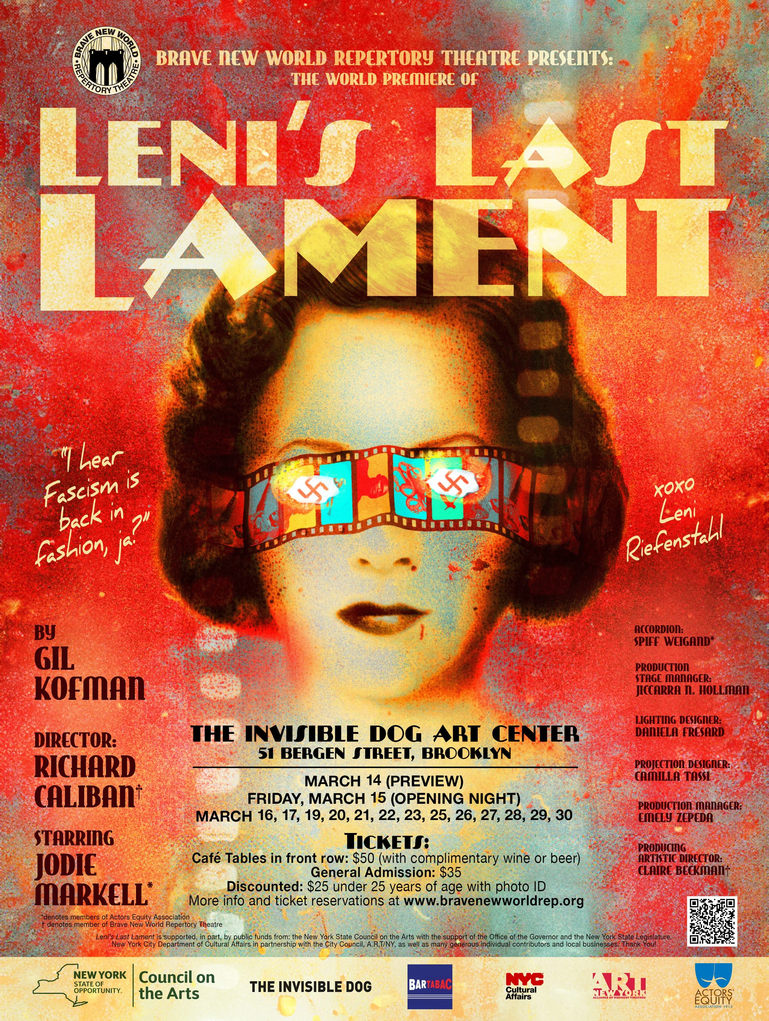 Leni’s Last Lament is supported, in part, by public funds from: The New York State Council on the Arts with the support of the Office of the Governor and the New York State Legislature, New York City Department of Cultural Affairs in partnership with the City Council, A.R.T/NY, as well as many generous individual contributors and local businesses. Thank You!